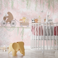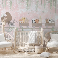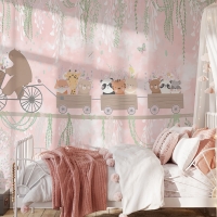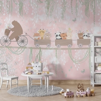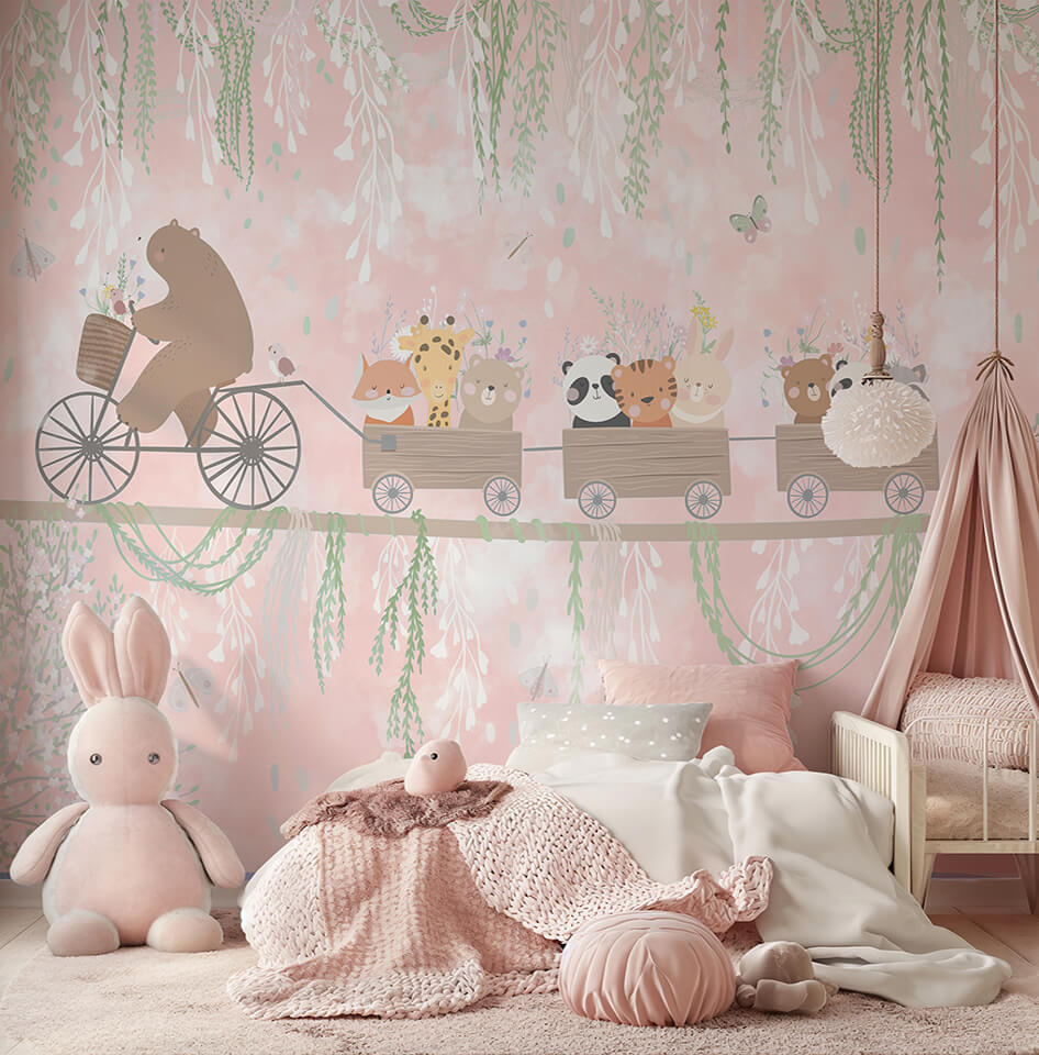 315 x 200 Tek Parça Premium Kumaş Tekstil - Çiçekli Vagonlar Serüveni Pembe Düşler Yolculuğu Bisikletli Ayı Çocuk Odası Duvar Kağıdı