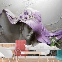 3D Duvar Kağıdı Mor Şapkalı Kadın Gri Soyut Taş Arka Plan