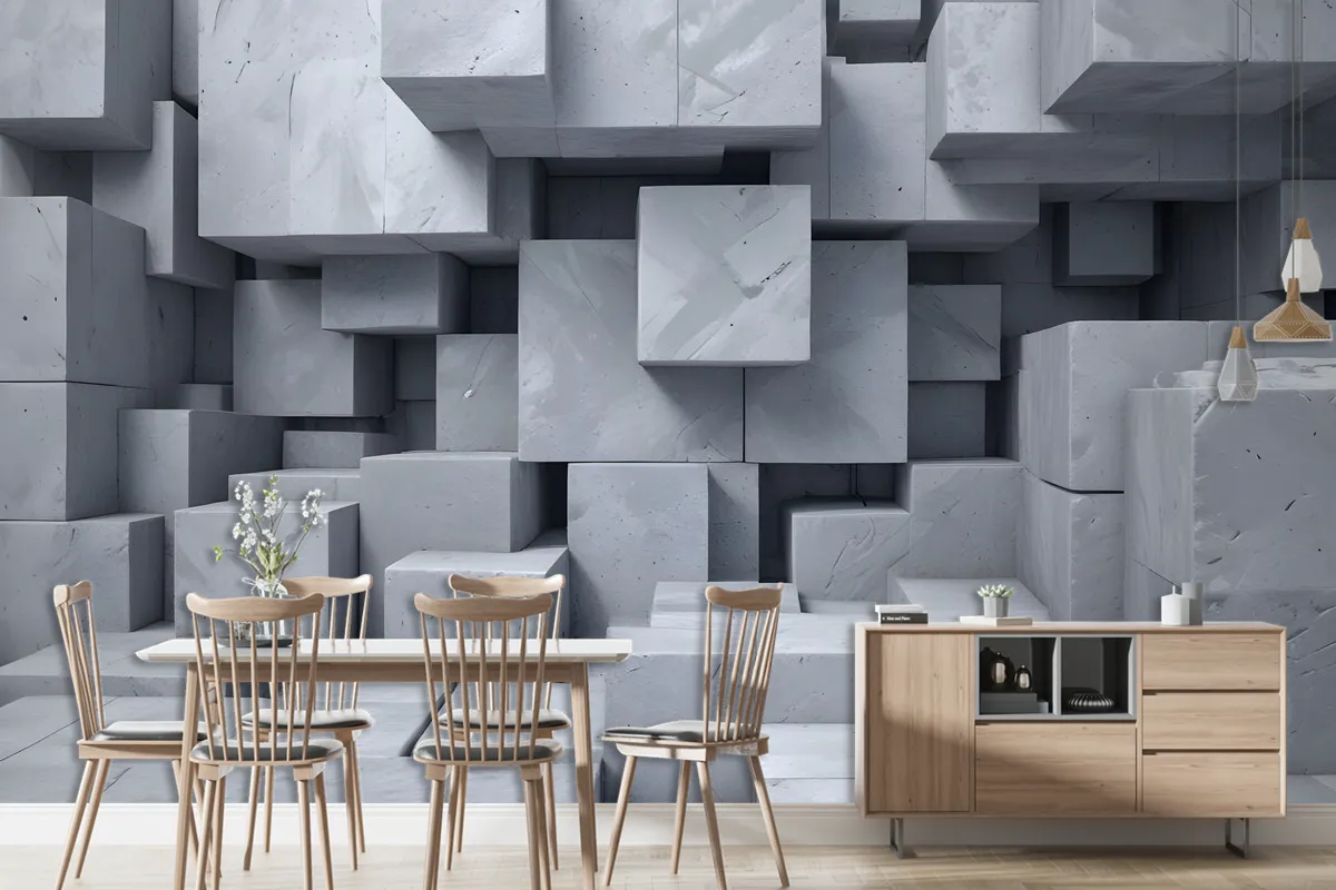 3D Görünümlü Beton Tarzı Gri Soyut Küpler Duvar Kağıdı
