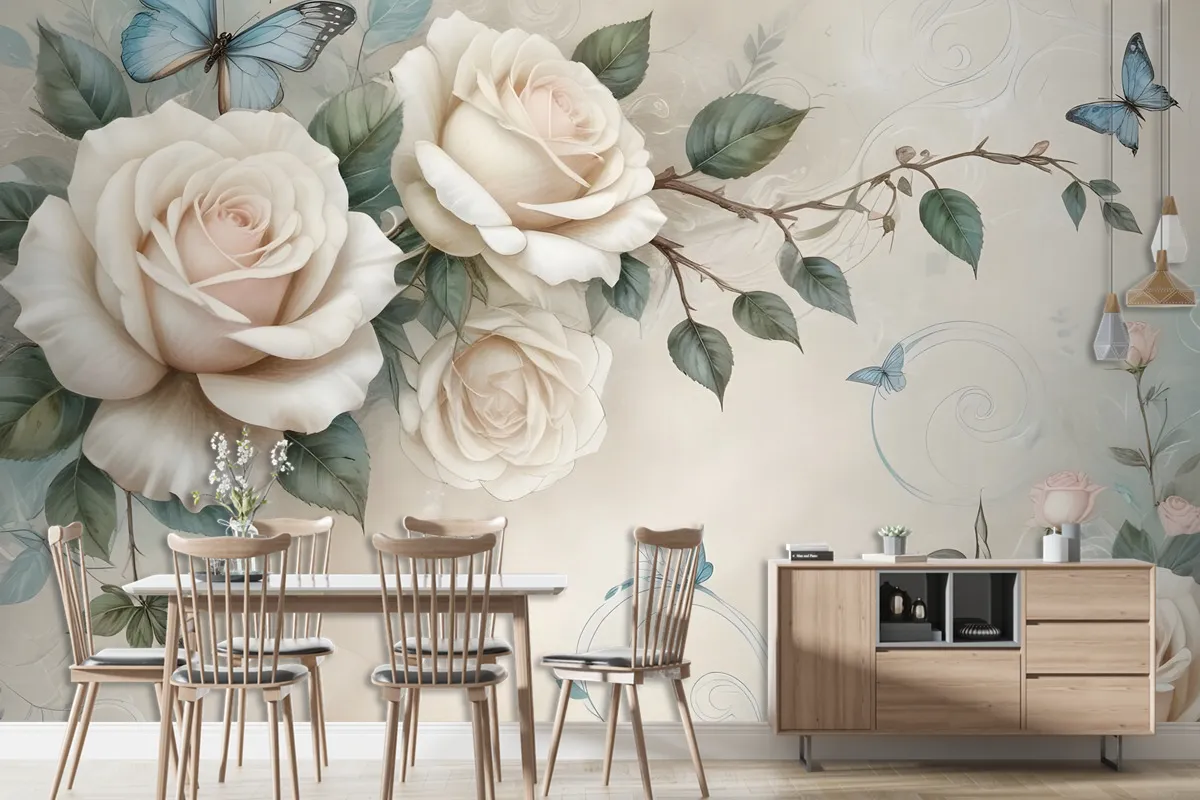 3D Görünümlü Krem Gül Çiçek Duvar Kağıdı