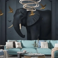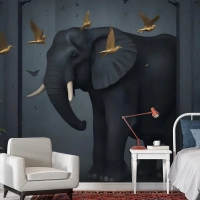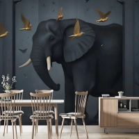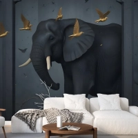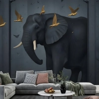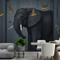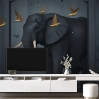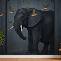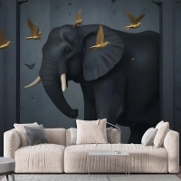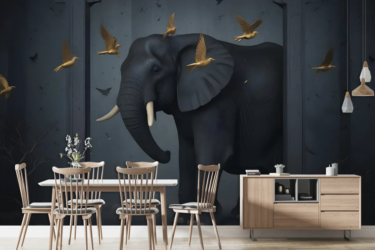 3D Kabartmalı Görünümlü Koyu Fil Ve Kuşlar Duvar Kağıdı