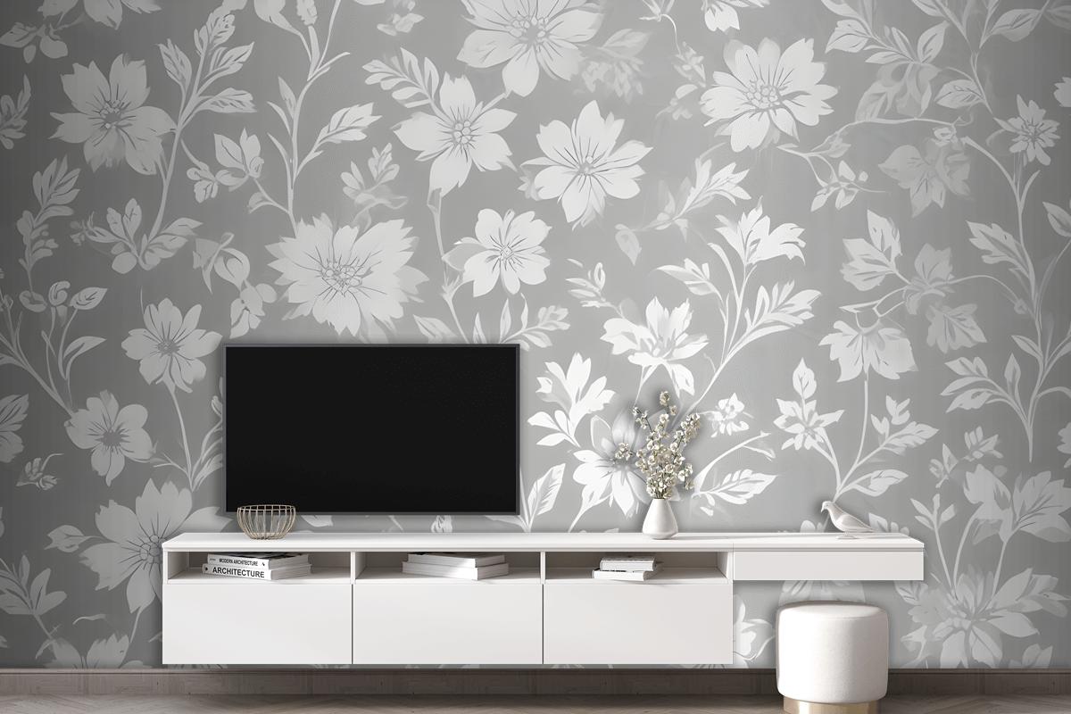 Açık Gri Oturma Odası Salon Duvar Kağıdı Duvarındaki Beyaz Çiçek Siluetlerinin Kusursuz Deseni