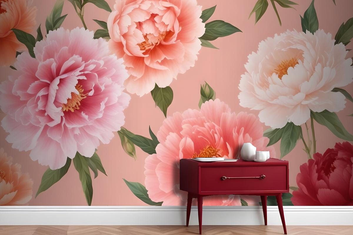 Açık Pembe Antre Hol Koridor Duvar Kağıdı Duvarında Yeşil Yapraklı Pembe Ve Şeftali Şakayıkları