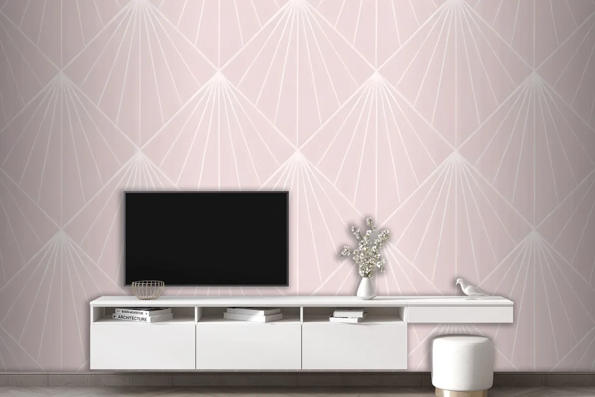 Açık Pembe Oturma Odası Salon Duvar Kağıdı Duvarında Beyaz Yayılan Çizgilerle Kesintisiz Geometrik Desen