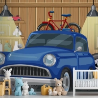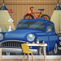 Ahşap Garajda Eski Model Araba Ve Bisiklet Çocuk Odası Duvar Kağıdı
