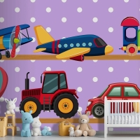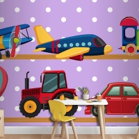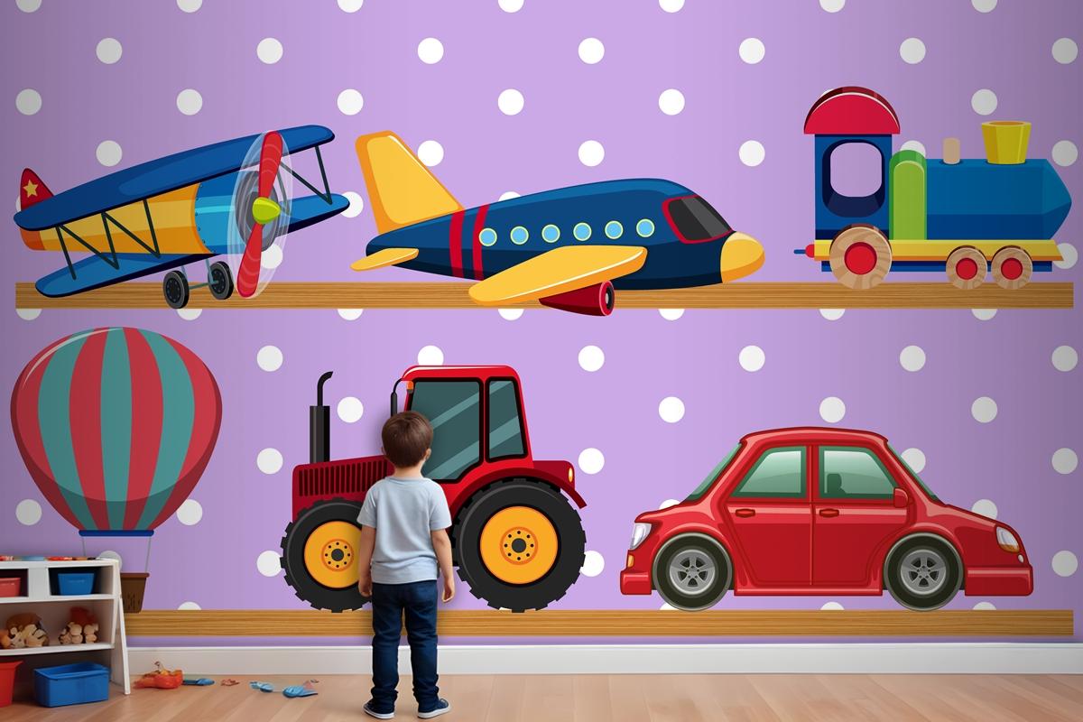 Ahşap Raflarda Birçok Taşıma Oyuncakları Çocuk Odası Duvar Kağıdı