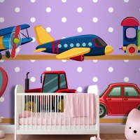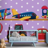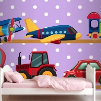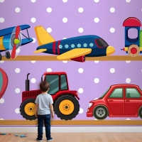 Ahşap Raflarda Birçok Taşıma Oyuncakları Çocuk Odası Duvar Kağıdı