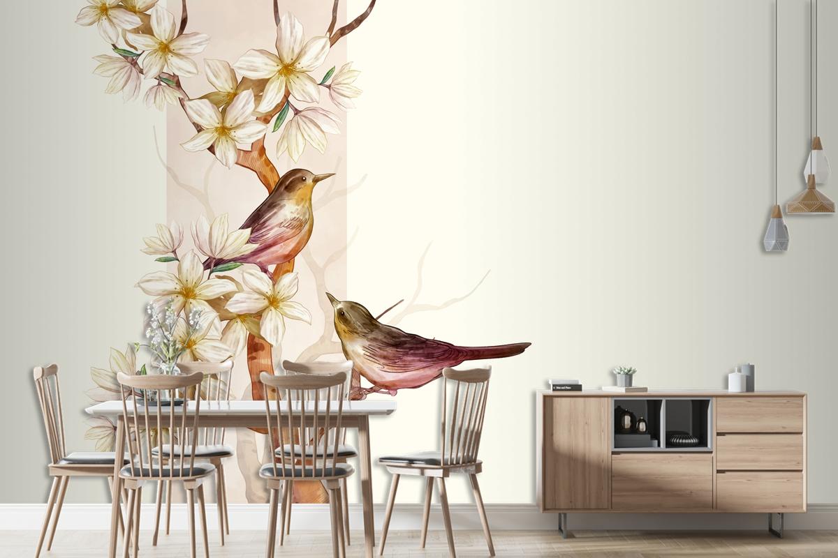 Asya Çiçek Suluboya Kuşlar Duvar Kağıdı
