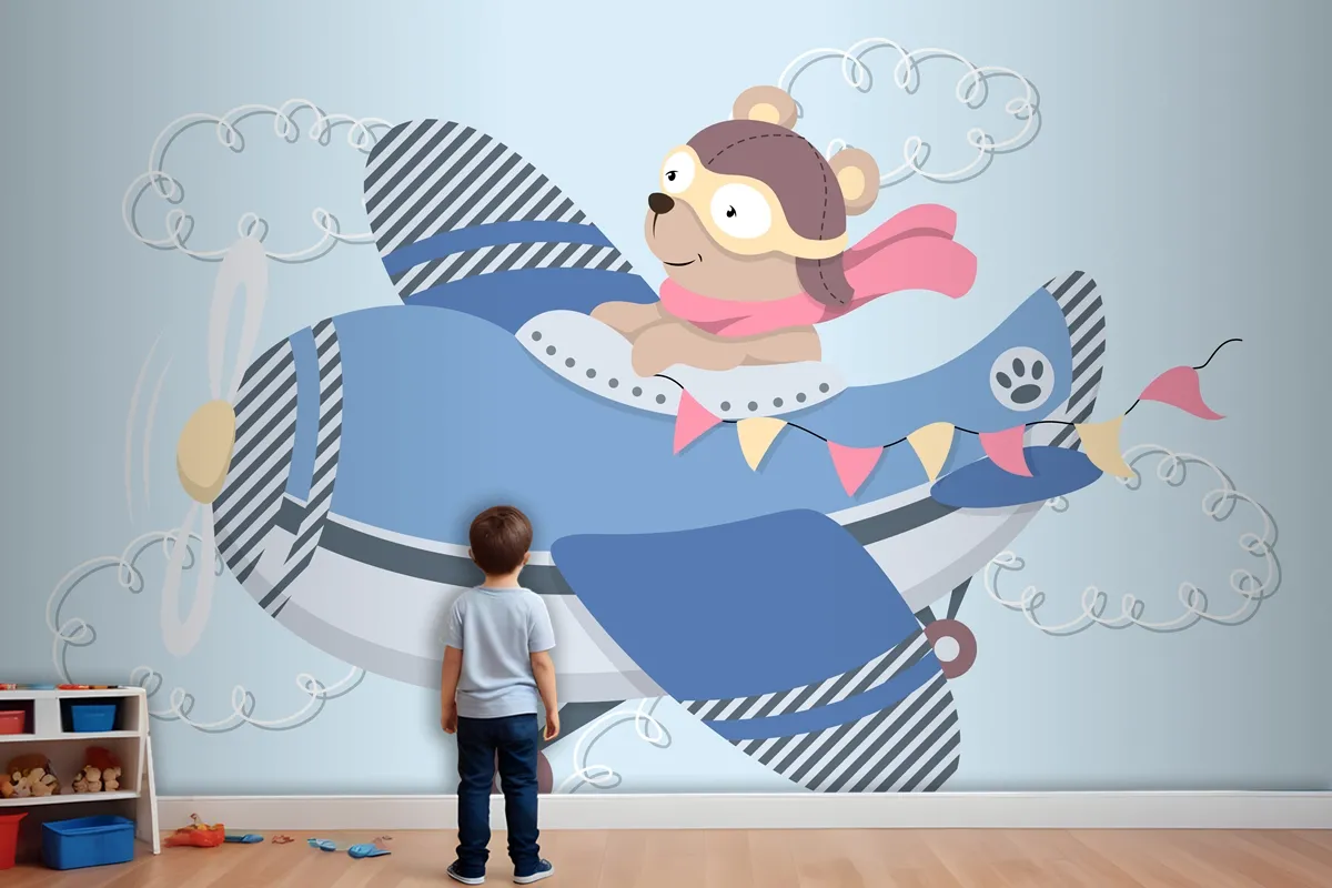 Aviator Gözlüklü Sevimli Karikatür Ayıcık Vintage Uçakta Uçan Deri Kask Ve Eşarp Çocuk Odası Duvar Kağıdı