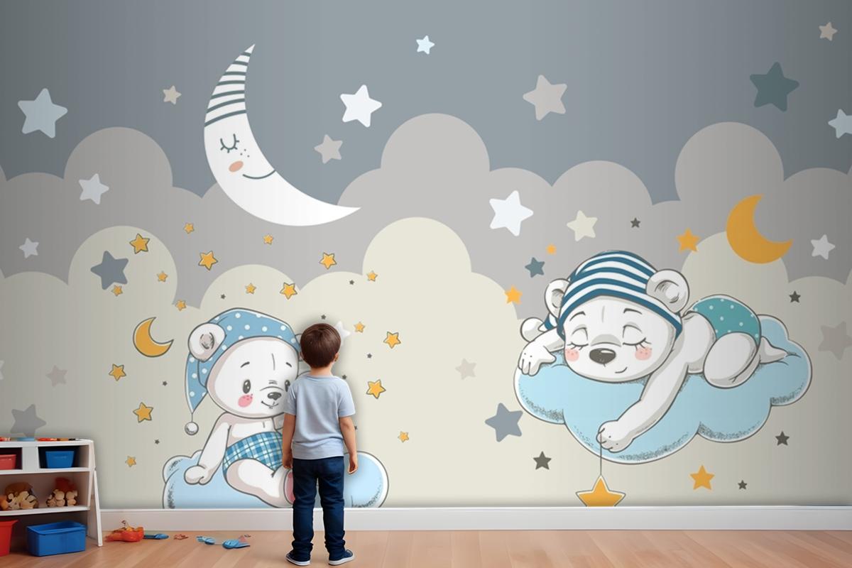 Ay Ve Yıldızlar Tüylü Bulutlar Teddy Ayılar Bebek Çocuk Odası Duvar Kağıdı