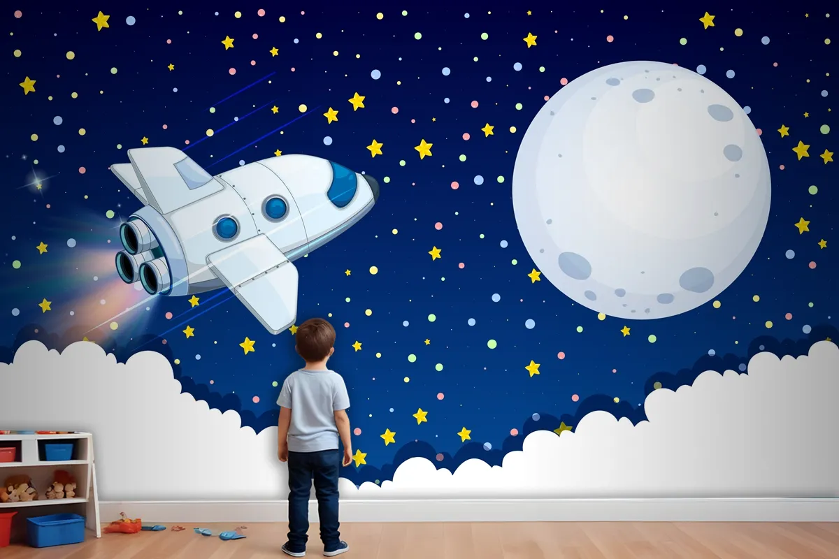 Aya Uçan Uzay Gemisi Çocuk Odası Duvar Kağıdı