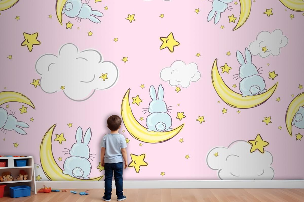Ayların Ve Yıldızların Üzerinde Oturan Sevimli Tavşanlarla Gece Gökyüzü Doodle Deseni Sorunsuz Çocuk Odası Duvar Kağıdı
