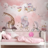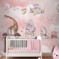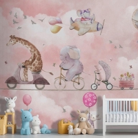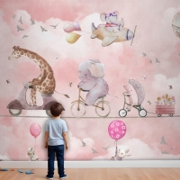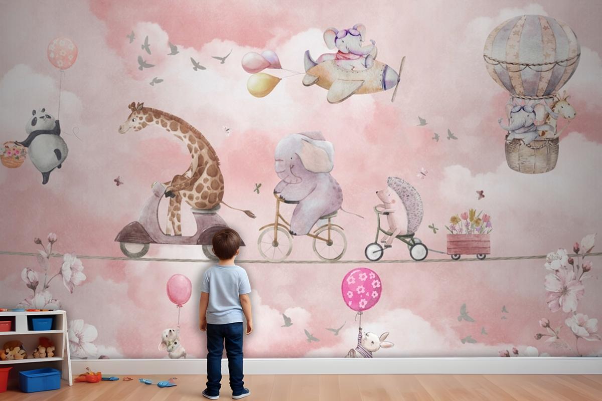 Balonlu Bisikletli Hayvanlar Suluboya Pembe Çocuk Odası Duvar Kağıdı