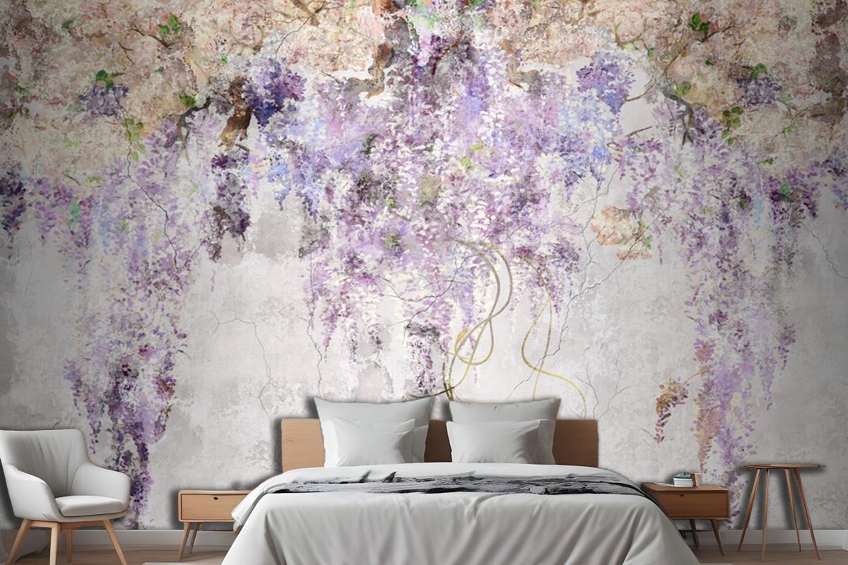 Beton Gri Vintage Yatak Odası Duvar Kağıdı Duvarındaki Güzel Leylak Dalları