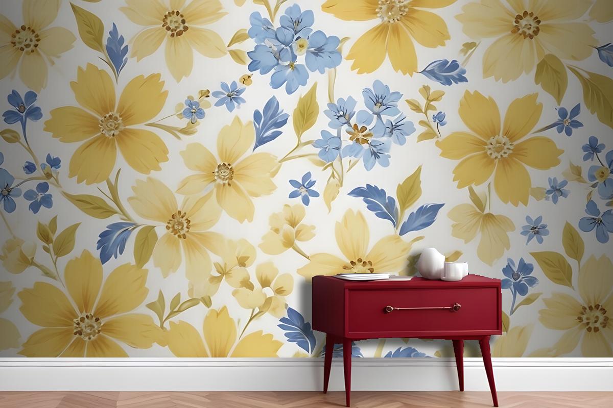Beyaz Antre Hol Koridor Duvar Kağıdı Duvarında Büyük Sarı Çiçekler Ve Daha Küçük Mavi Çiçeklerle Çiçek Desenli