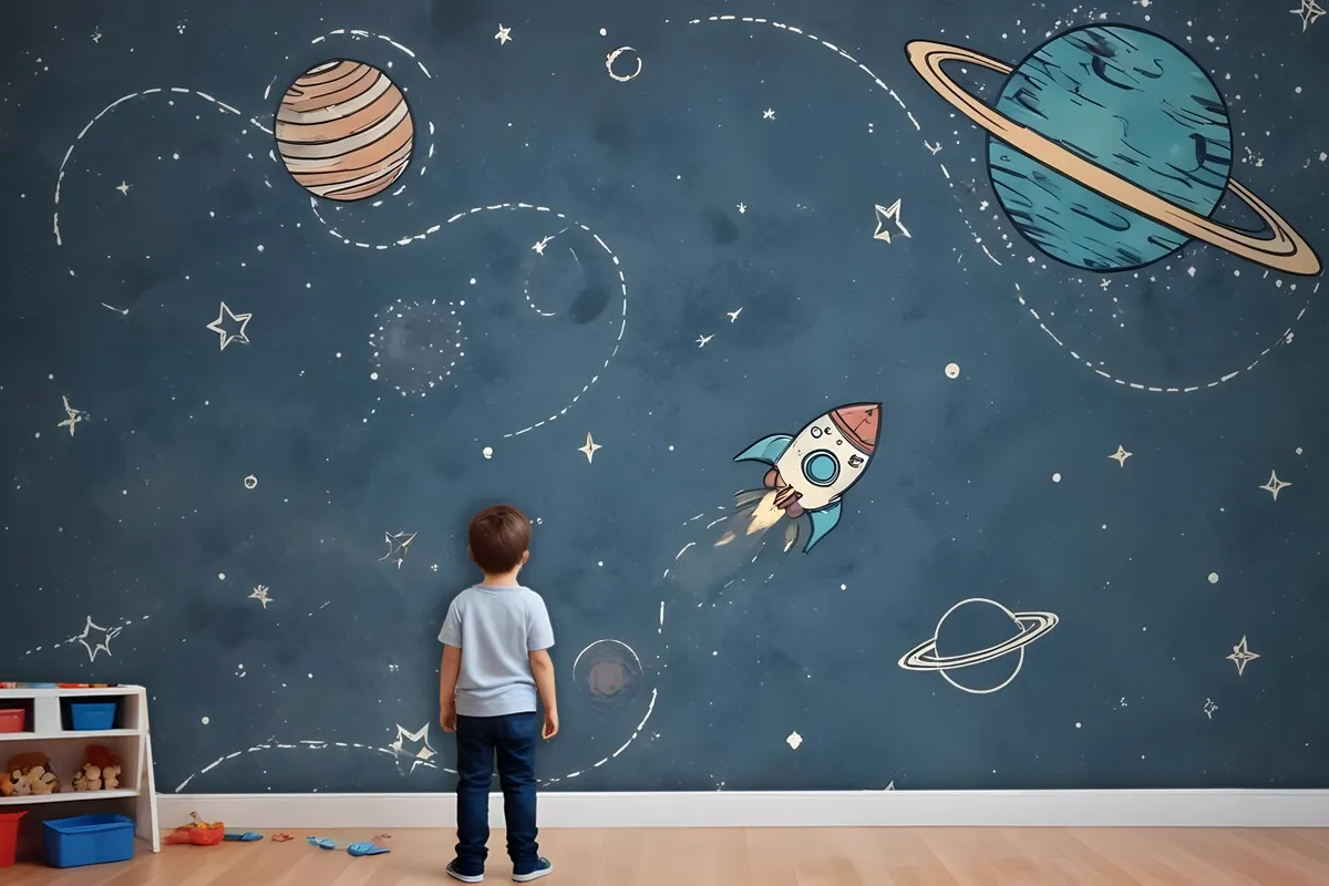 Beyaz Şerit Çocuk Odası Duvar Kağıdı Ile Parlayan Karikatür Uzay Çocuklar