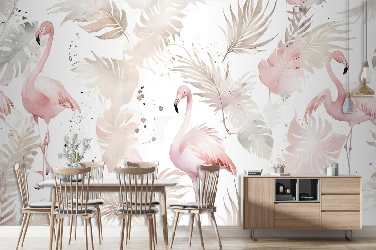 Boho Tropikal Yaprak Duvar Kağıdı Ile Yumuşak Flamingo Sanatı