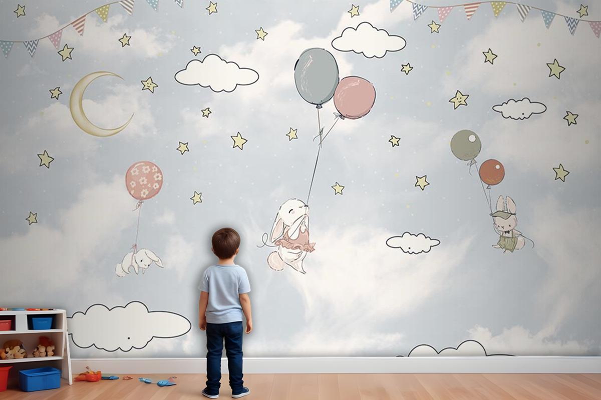 Bulutlar Arasında Balonlar Ve Tavşanlar Çocuk Odası Duvar Kağıdı