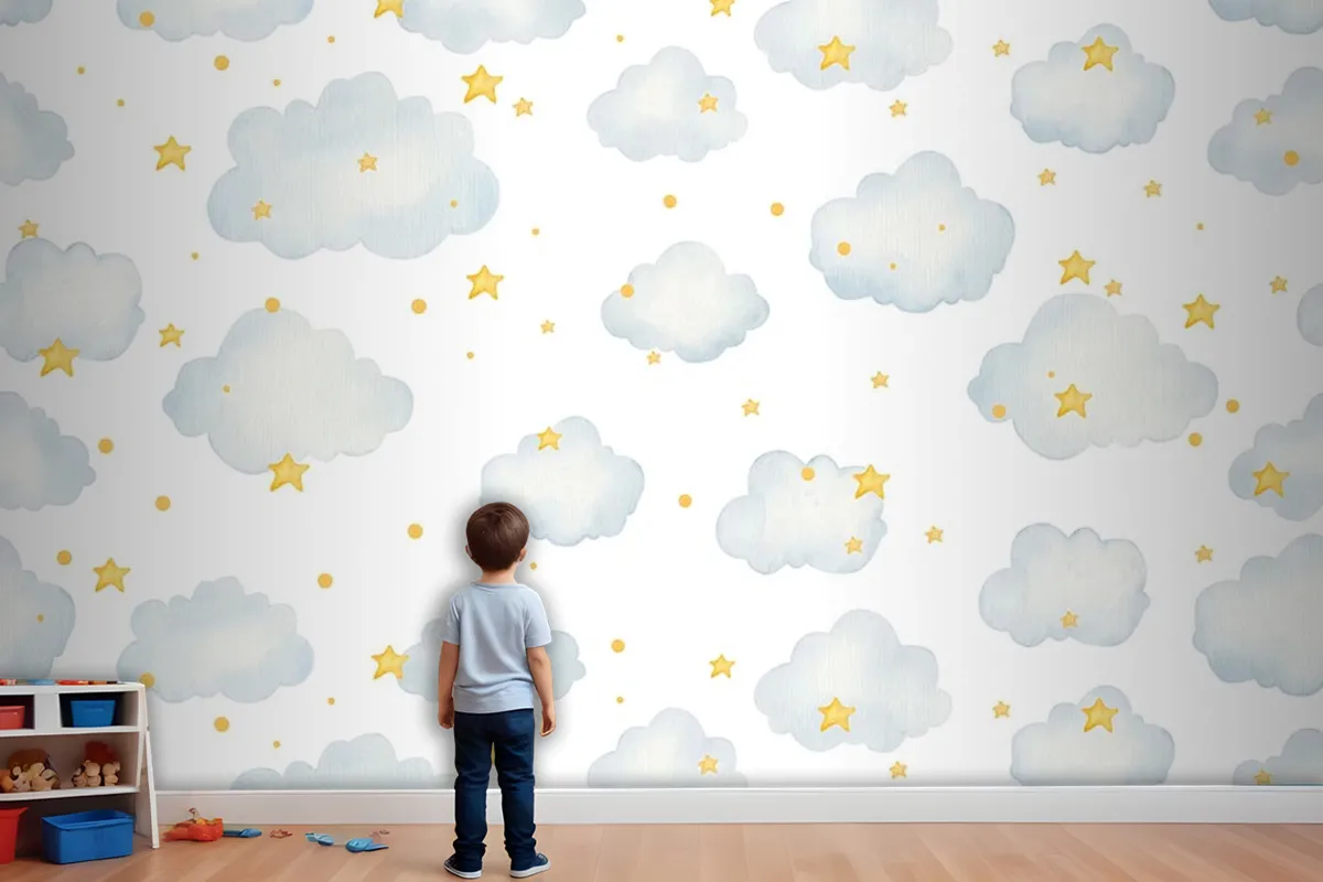 Bulutlu Ve Yıldızlı Çocuk Odası Duvar Kağıdı