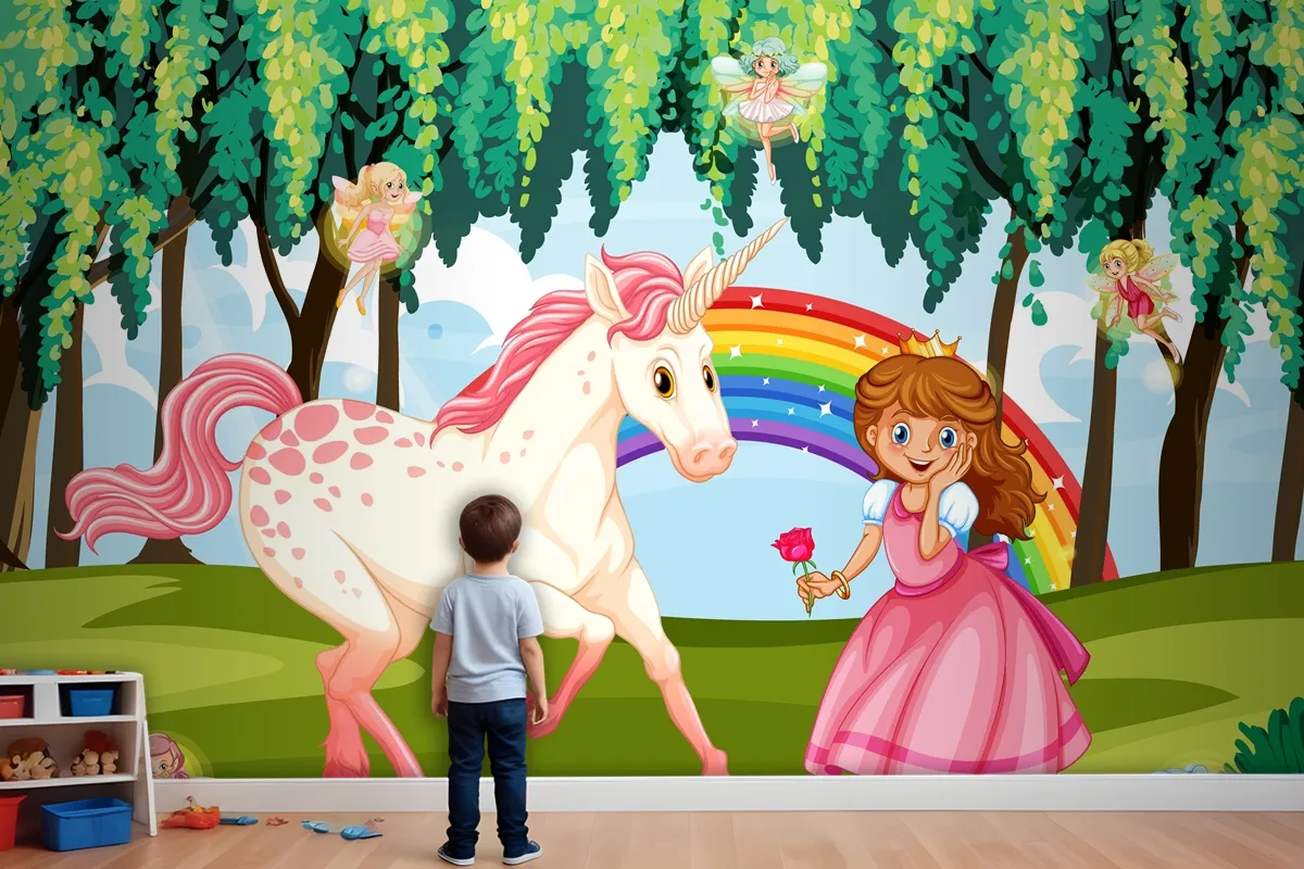 Büyülü Ormanda Prenses Ve Tek Boynuzlu At Arka Plan Çocuk Odası Duvar Kağıdı