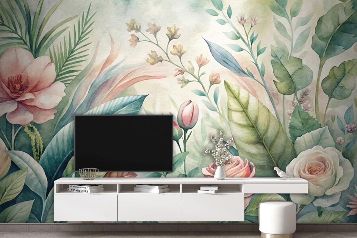 Çeşitli Botanik Ve Çiçeklerin Suluboya Arka Planları Oturma Odası Duvar Kağıdı