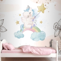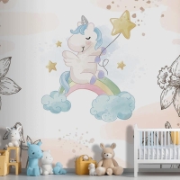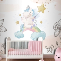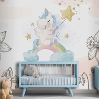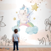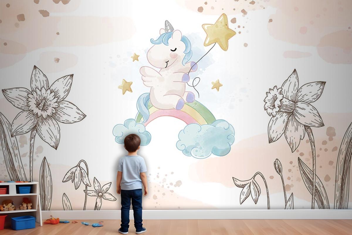 Çiçekler Arasında Unicorn Çocuk Odası Duvar Kağıdı