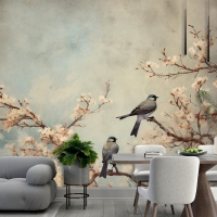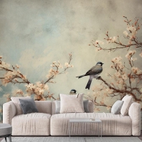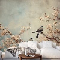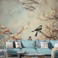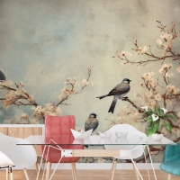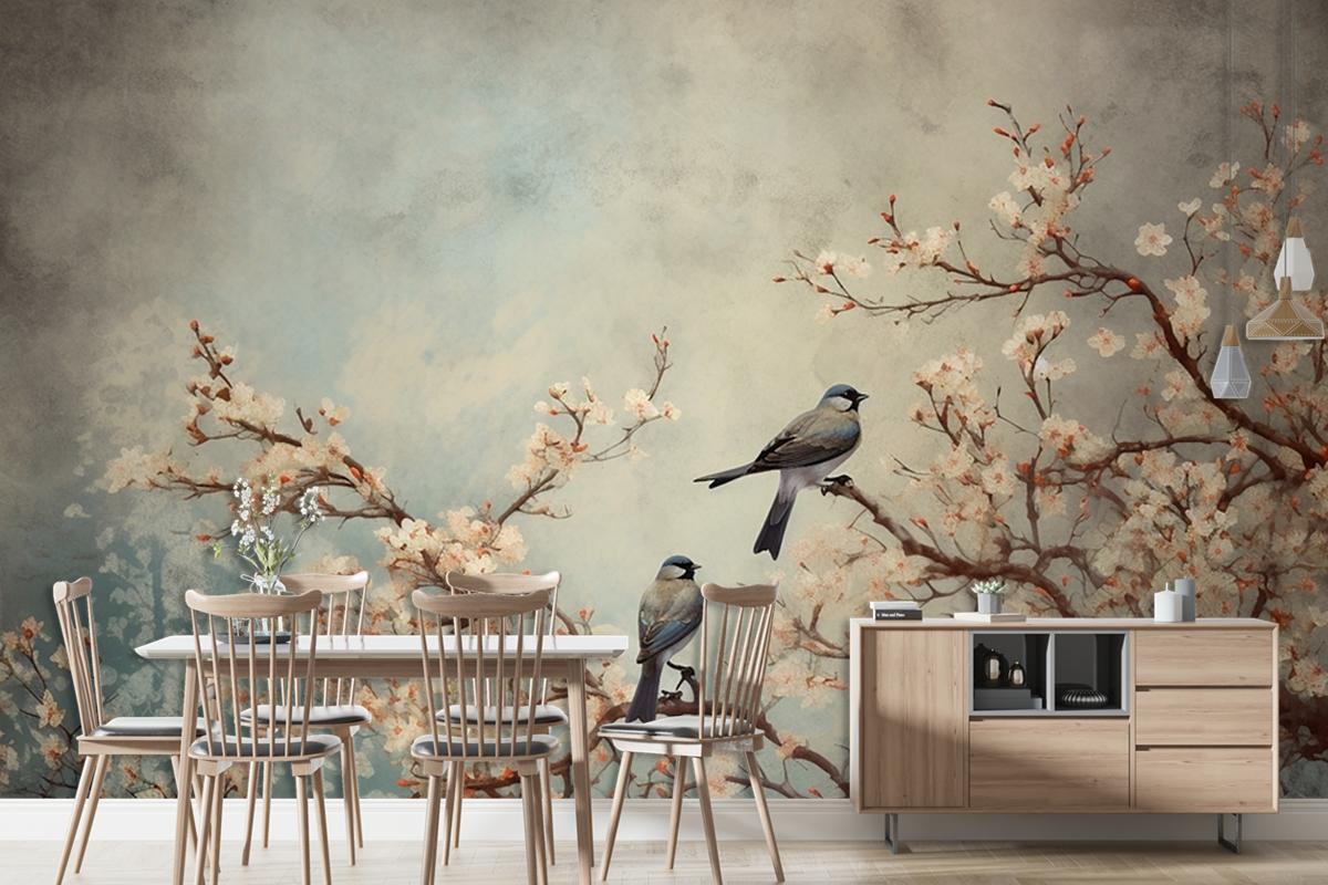 Çiçekler Dallar Kuşlar Altın Fırça Darbeleri Duvar Kağıdı