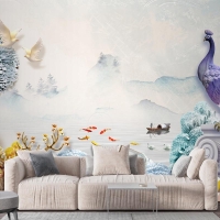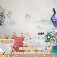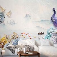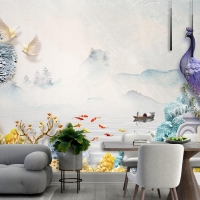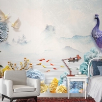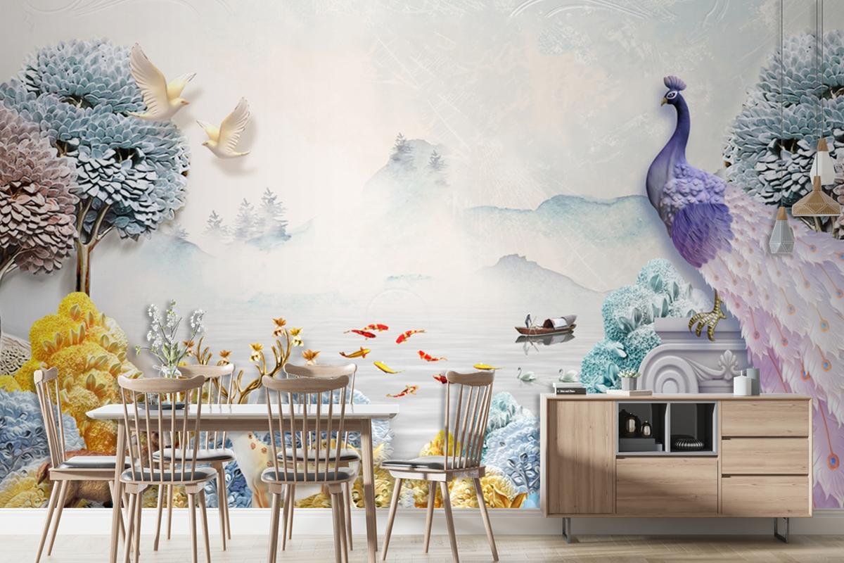 Çiçekli Ve Tavus Kuşu Arka Planlı 3D Duvar Kağıdı Tasarımı
