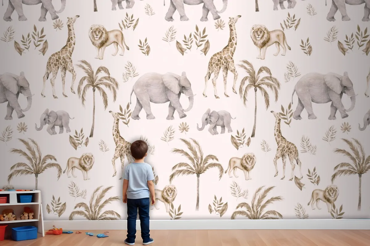 Çocuk Odası Bulutlu Çocuk Odası Duvar Kağıdı Palmiye Ağaçları Ve Safari Hayvanları