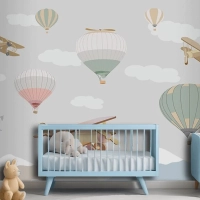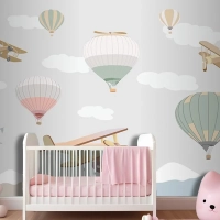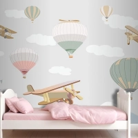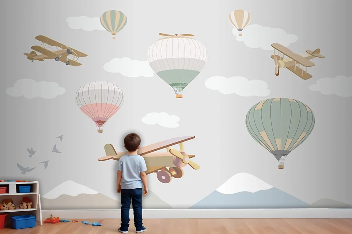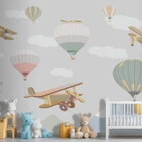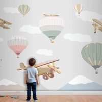 Çocuk Odası Duvar Kağıdı Bulutlar Üzerinde Uçaklar Ve Uçan Balonlar
