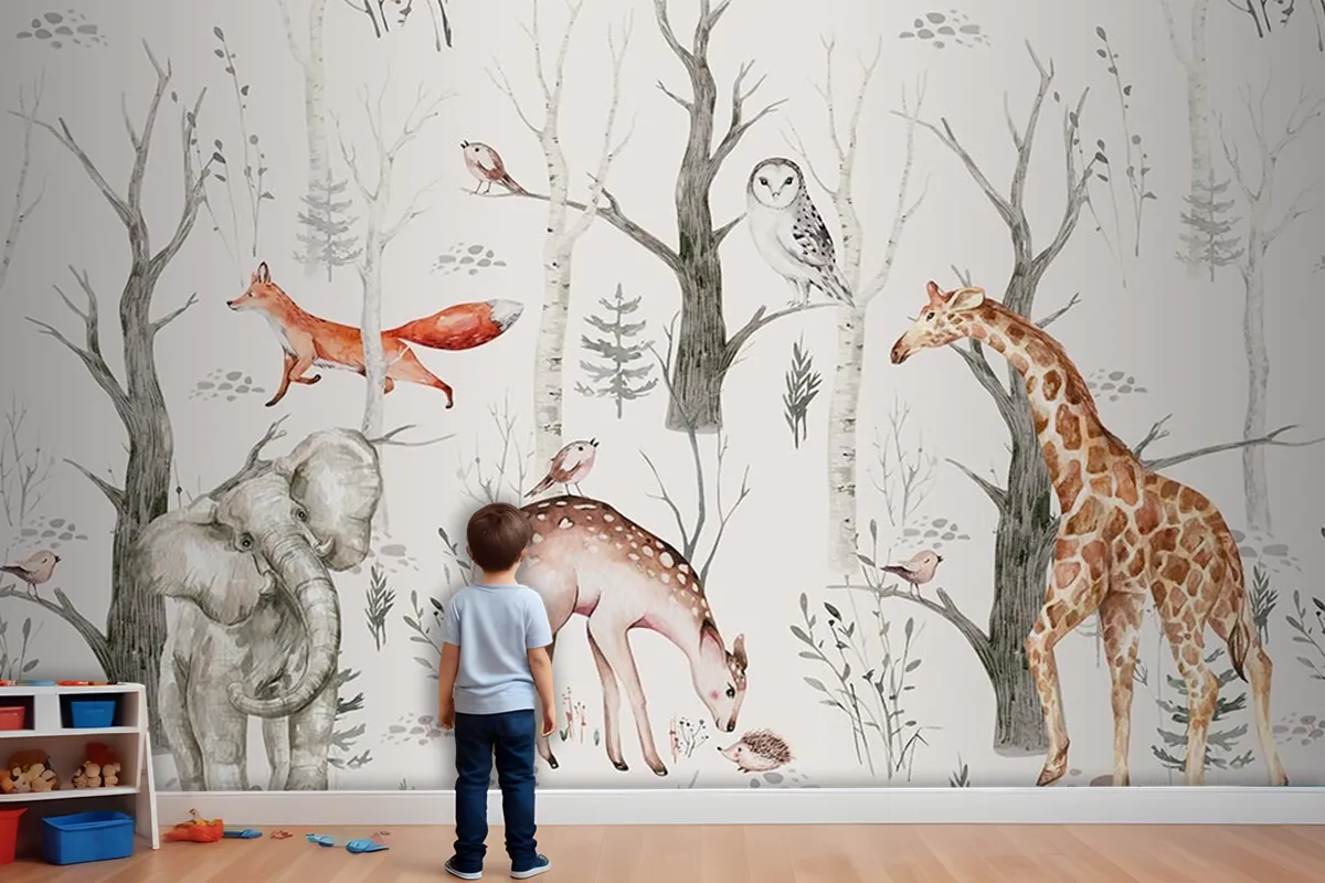 Çocuk Odası Duvar Kağıdı Ormanda Fil Zürafa