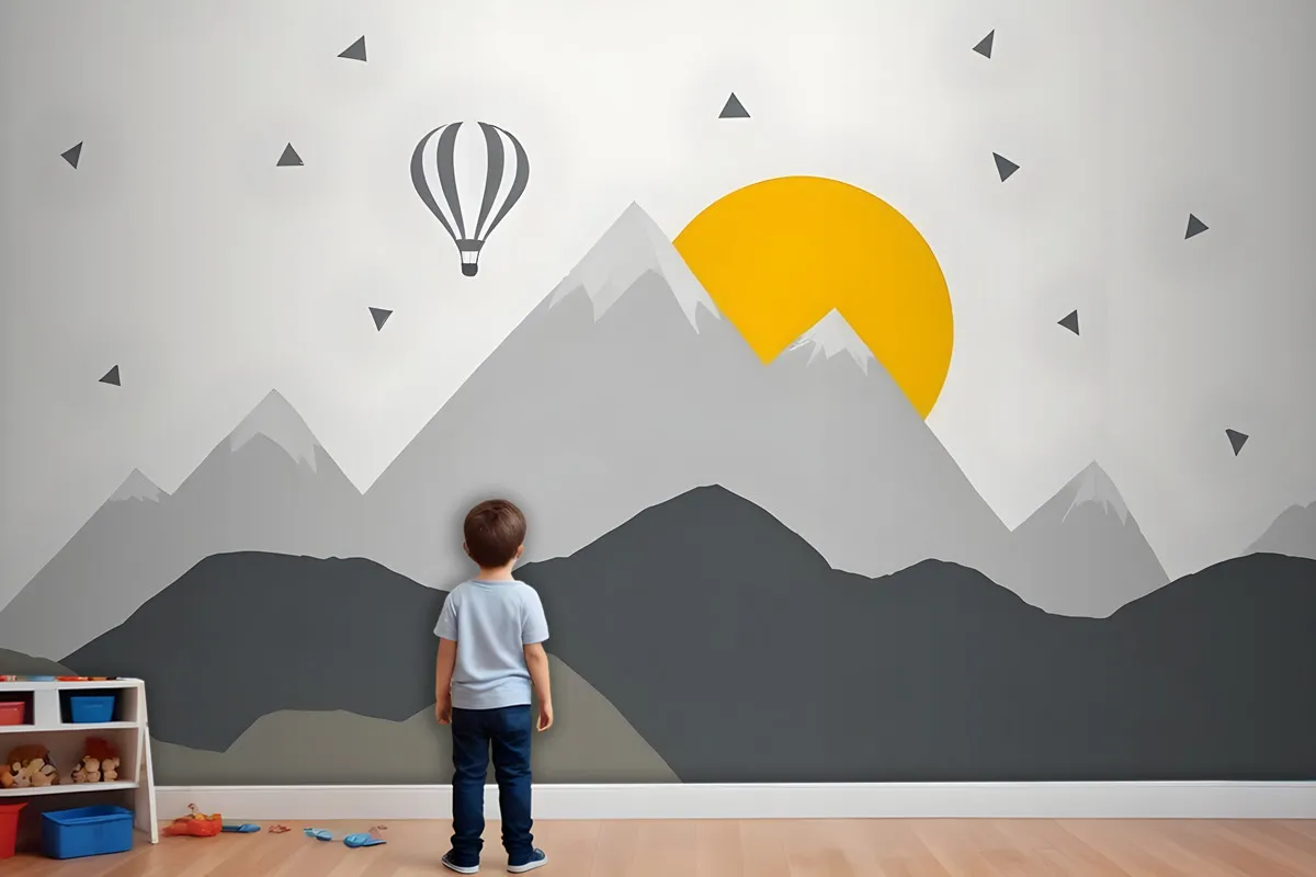 Çocuklar Gri Geometrik Dağ Manzarası Ve Sıcak Hava Balonu Çocuk Odası Duvar Kağıdı