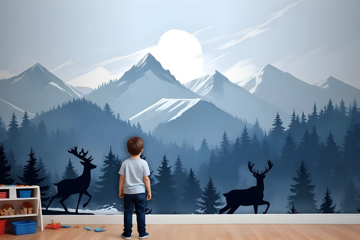 Çocuklar Için Boynuzlu Geyik Silueti Ile Tek Renkli Koyu Mavi Karlı Orman Çocuk Odası Duvar Kağıdı