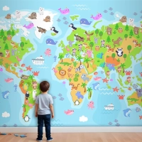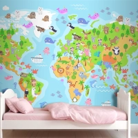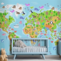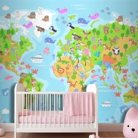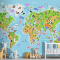 Çocuklar Için Hayvanlarla Dünya Haritası Çocuk Odası Duvar Kağıdı