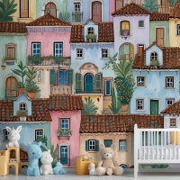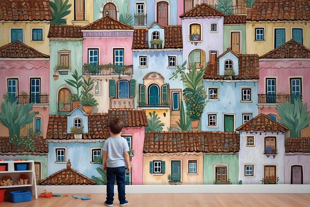 Çocuklar Suluboya Ortaçağ Evi Bitkilerle Çocuk Odası Duvar Kağıdı