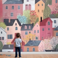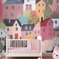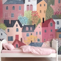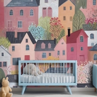 Çocuklar Suluboya Sevimli Kasaba Evi Çocuk Odası Duvar Kağıdı