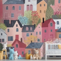 Çocuklar Suluboya Sevimli Kasaba Evi Çocuk Odası Duvar Kağıdı