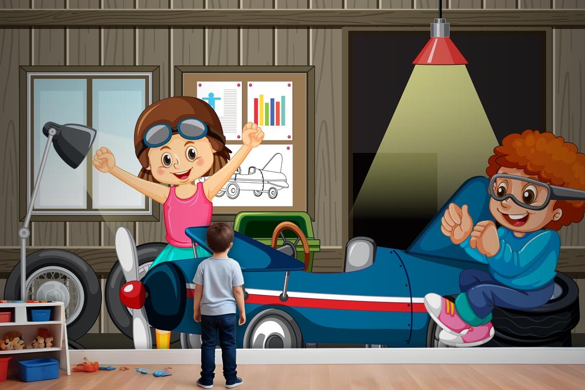 Çocukların Birlikte Araba Tamir Ettiği Garaj Sahnesi Çocuk Odası Duvar Kağıdı