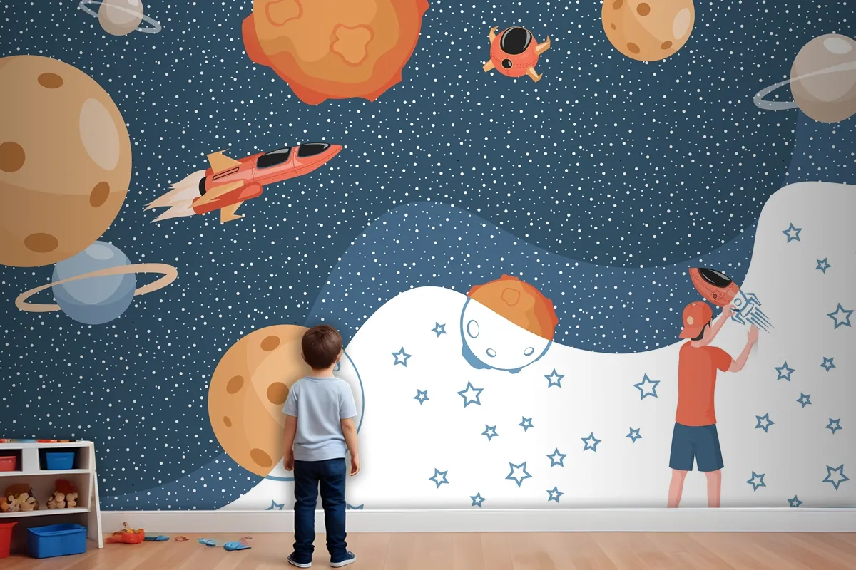 Cosmos Gezegenler Uzay Gemileri Ve Yıldızlar Çizim Çocuk Odası Duvar Kağıdı