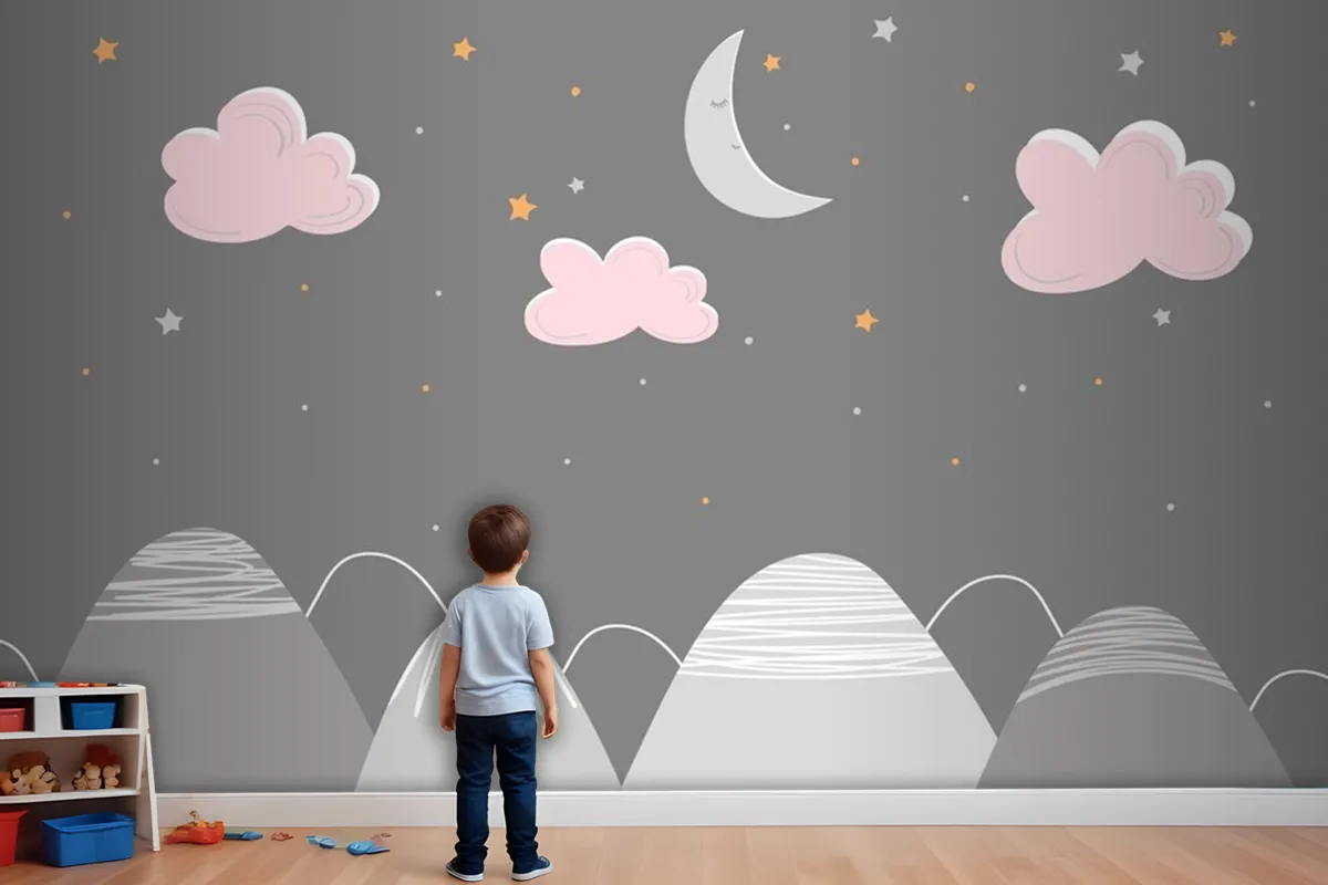 Dağ Manzarası Bulutlar Ve Uyuyan Ay Çocuk Odası Duvar Kağıdı Ile İskandinav Tarzında Dekor
