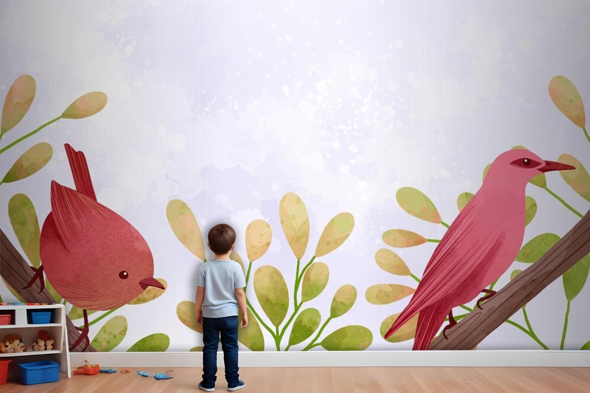 Dallarda Oturan Kuşların Güzel Suluboya Çocuk Odası Duvar Kağıdı