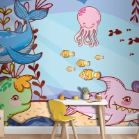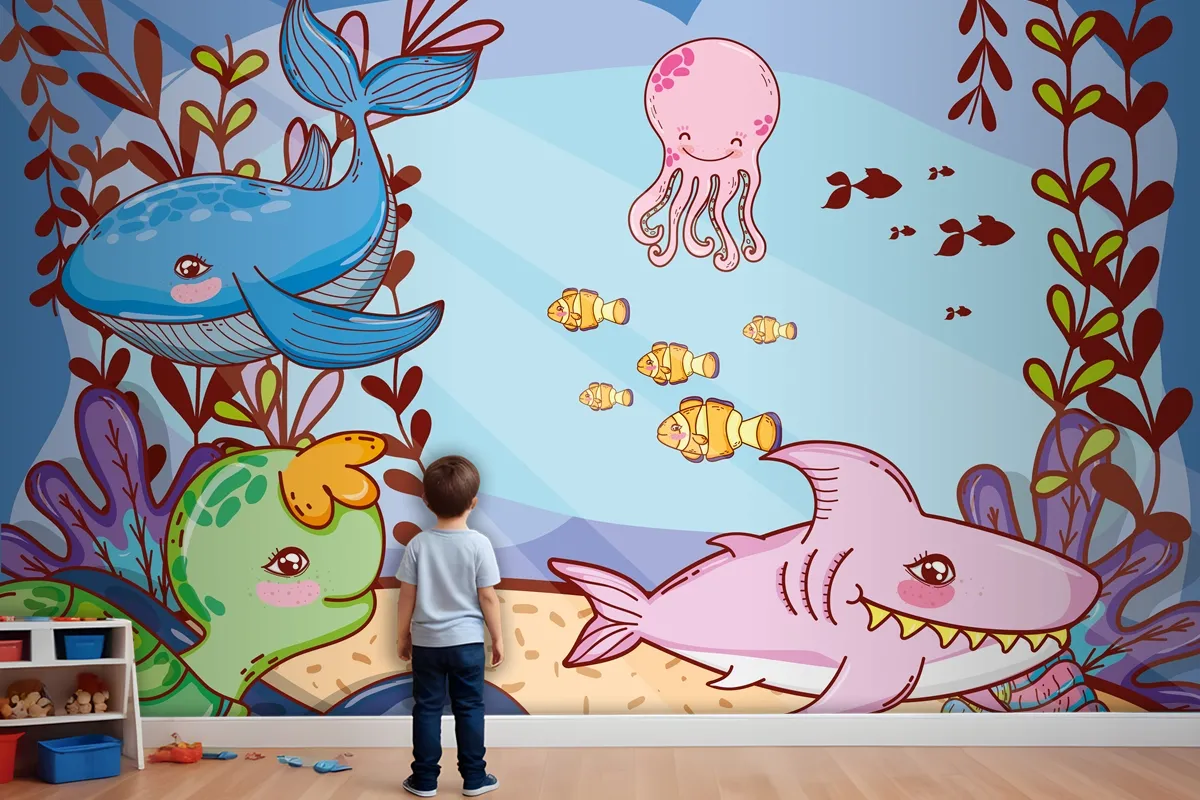 Deniz Yosunu Bitkileri Ile Sevimli Deniz Hayvanları Çocuk Odası Duvar Kağıdı