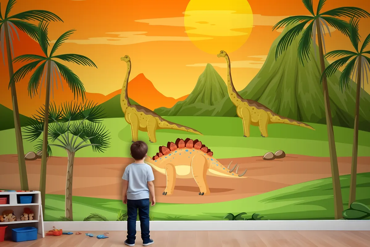 Dinozor Karikatür Çocuk Odası Duvar Kağıdı Ile Tarih Öncesi Orman