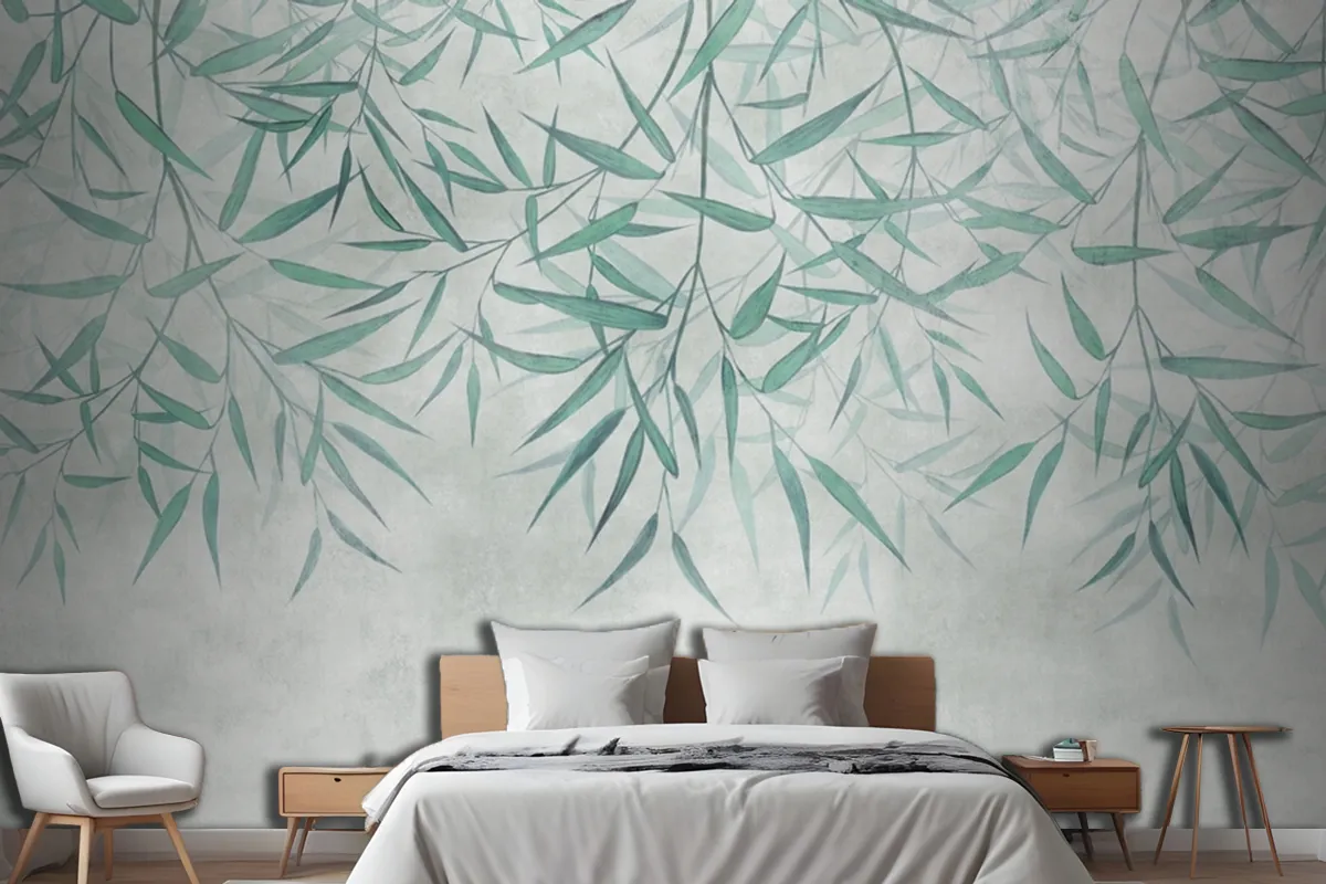 Dokulu Bir Arka Plan Üzerinde Yukarıdan Asılı Boyalı Kamış Bambu Yaprakları Yatak Odası Duvar Kağıdı