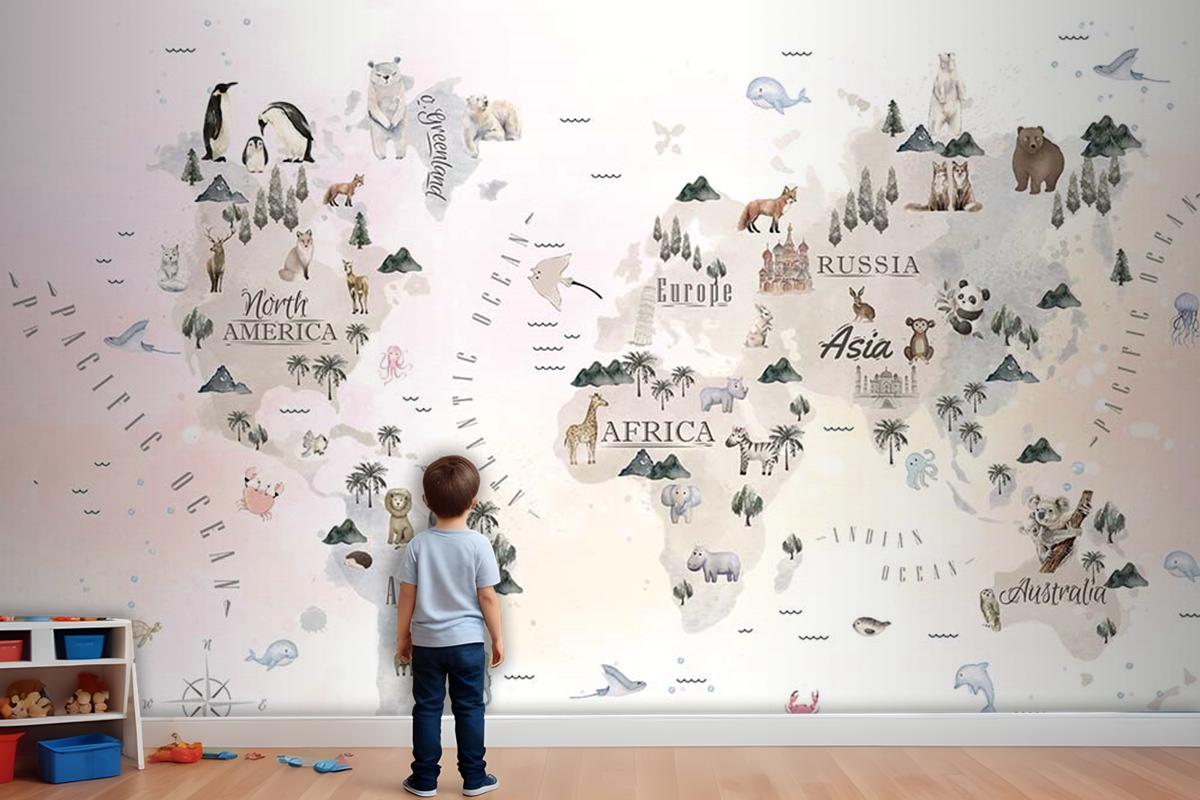 Dünya Üzerinde Sevimli Hayvanlar Çocuk Odası Duvar Kağıdı