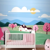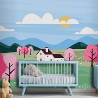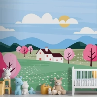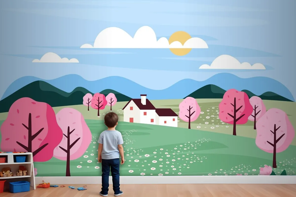 Düz Tasarım Bahar Manzara Çocuk Odası Duvar Kağıdı