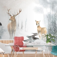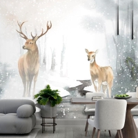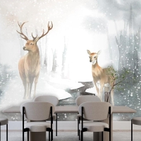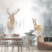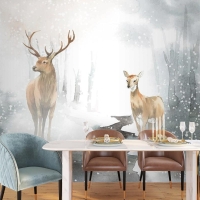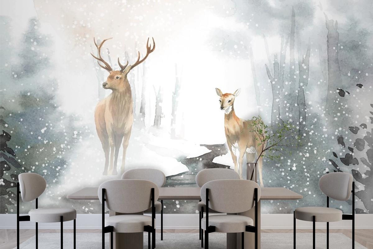 Elle Çizilmiş Geyik Çifti Suluboya Tarzı Yemek Odası Duvar Kağıdı