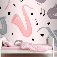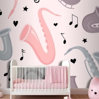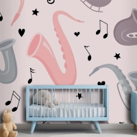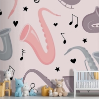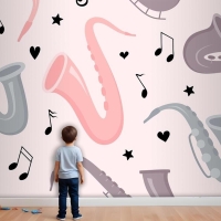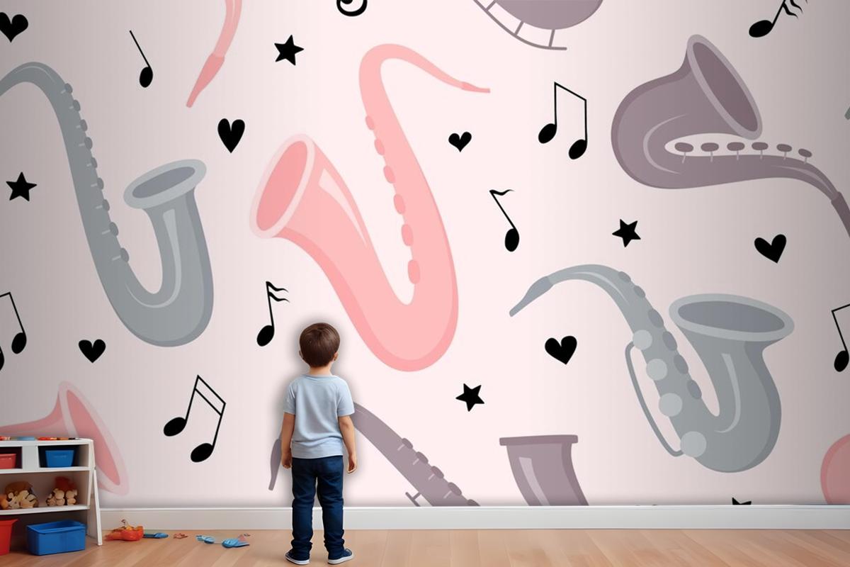 Elle Çizilmiş Saksafon Dikişsiz Desen Çocuk Odası Duvar Kağıdı