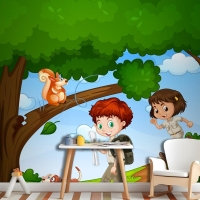 Erkek Ve Kız Sevimli Hayvan Sahnesi Çocuk Odası Duvar Kağıdı Yle Parkta Keyfini Çıkarıyor