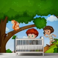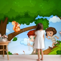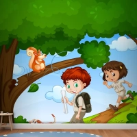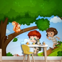 Erkek Ve Kız Sevimli Hayvan Sahnesi Çocuk Odası Duvar Kağıdı Yle Parkta Keyfini Çıkarıyor